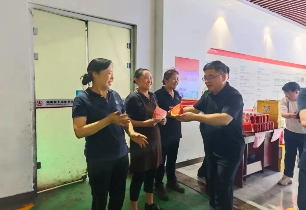 暑氣蒸騰,關(guān)懷沁潤。7月21日,湖南航天黨委書記、董事長鮑斌一行赴湖南磁電生產(chǎn)一線開展高溫慰問,為酷暑中堅(jiān)守崗位的一線職工送去清涼物資與深切關(guān)懷,在瓦磁成型、燒結(jié)車間,為堅(jiān)守在崗位的一線人員送上涼茶、西瓜等慰問物資。